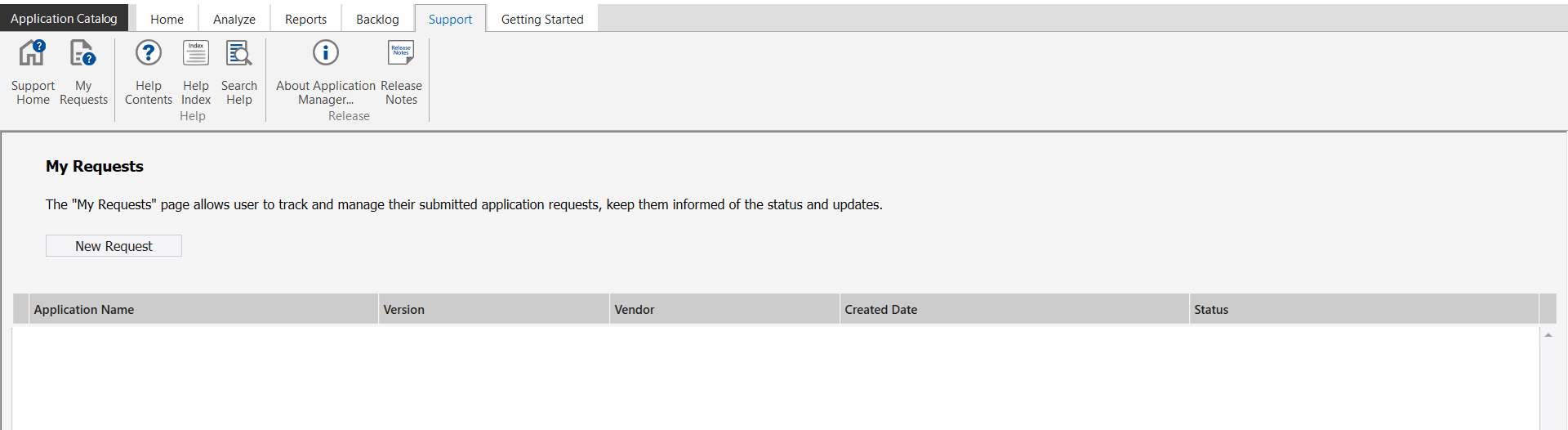 A new My Requests tab has been added to the Support tab on the Application Manager ribbon. This enhancement allows you to monitor and manage your submitted package requests, including tracking their progress with real-time status updates.