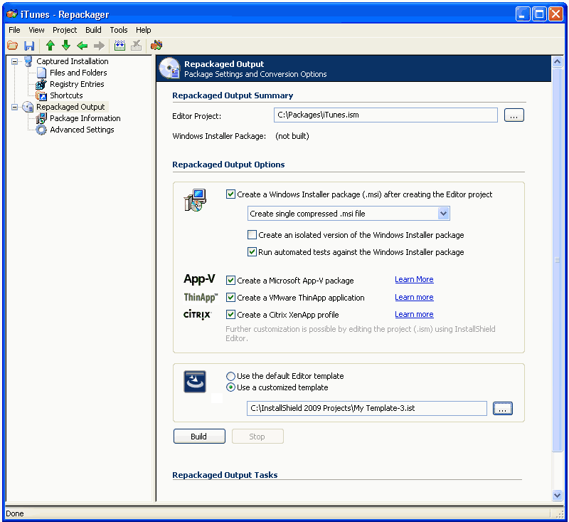- From within the Repackager interface, you can start using this customized template by selecting the Use a customized template option in the Repackaged Output view, and selecting the InstallShield Editor template that you just created.