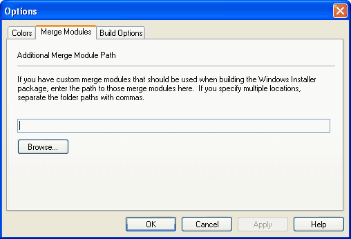 If you have custom merge modules that should be used when building a Windows Installer package, you need to specify the directories that contain those custom merge modules on the Merge Modules tab of the Options dialog box.