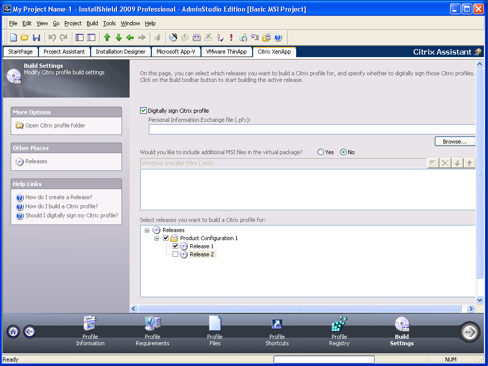 However, you do need to run the build process to build a Citrix profile for this Windows Installer package. To enable the Build button to build the Citrix profile, select the Build Citrix Profile option on the Build Settings page.