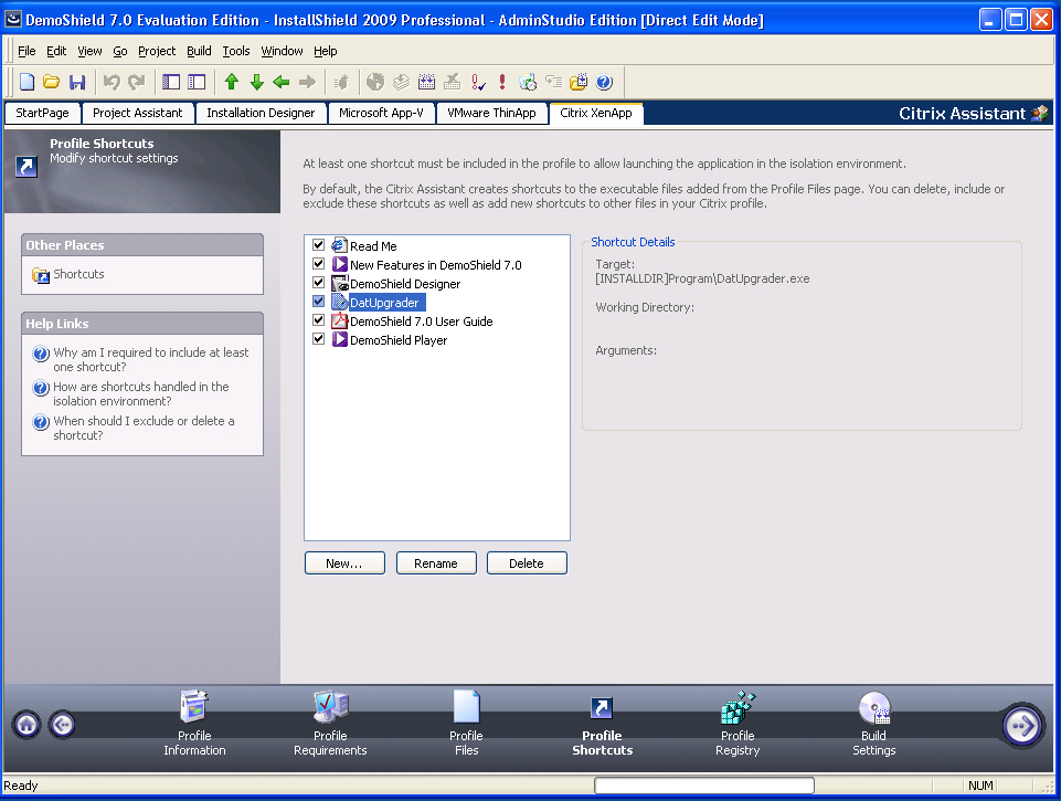 Deleting a Shortcut—When you delete a shortcut, it is removed from both the Citrix profile and the InstallShield project. This means that the shortcut would also be deleted from the Windows Installer package that is built from this InstallShield project. See Deleting a Shortcut.