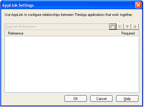 AppLink ReferencesList of ThinApp applications that are linked to the open ThinApp application. The following information is listed: Reference —List of linked ThinApp applications, including the application location and name. Required —If Yes is listed in this column, the linked application must be available in order for the ThinApp application to run. If the linked application cannot be found, the ThinApp application will fail to run. See Required and Optional Linked Applications for more information.