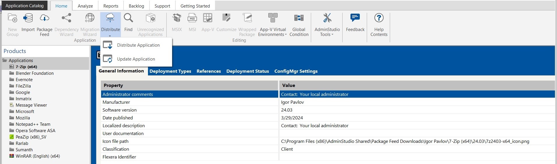 1. In the Application Catalog tree, select the application or group of applications that you want to update and click the Distribute > Update Application in the ribbon. Alternatively, right-click on an application and select Update Application from the from the context menu.