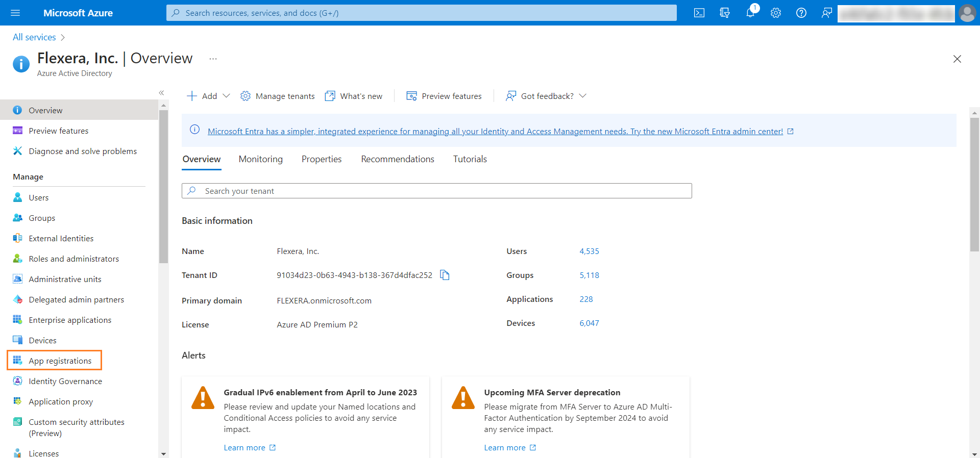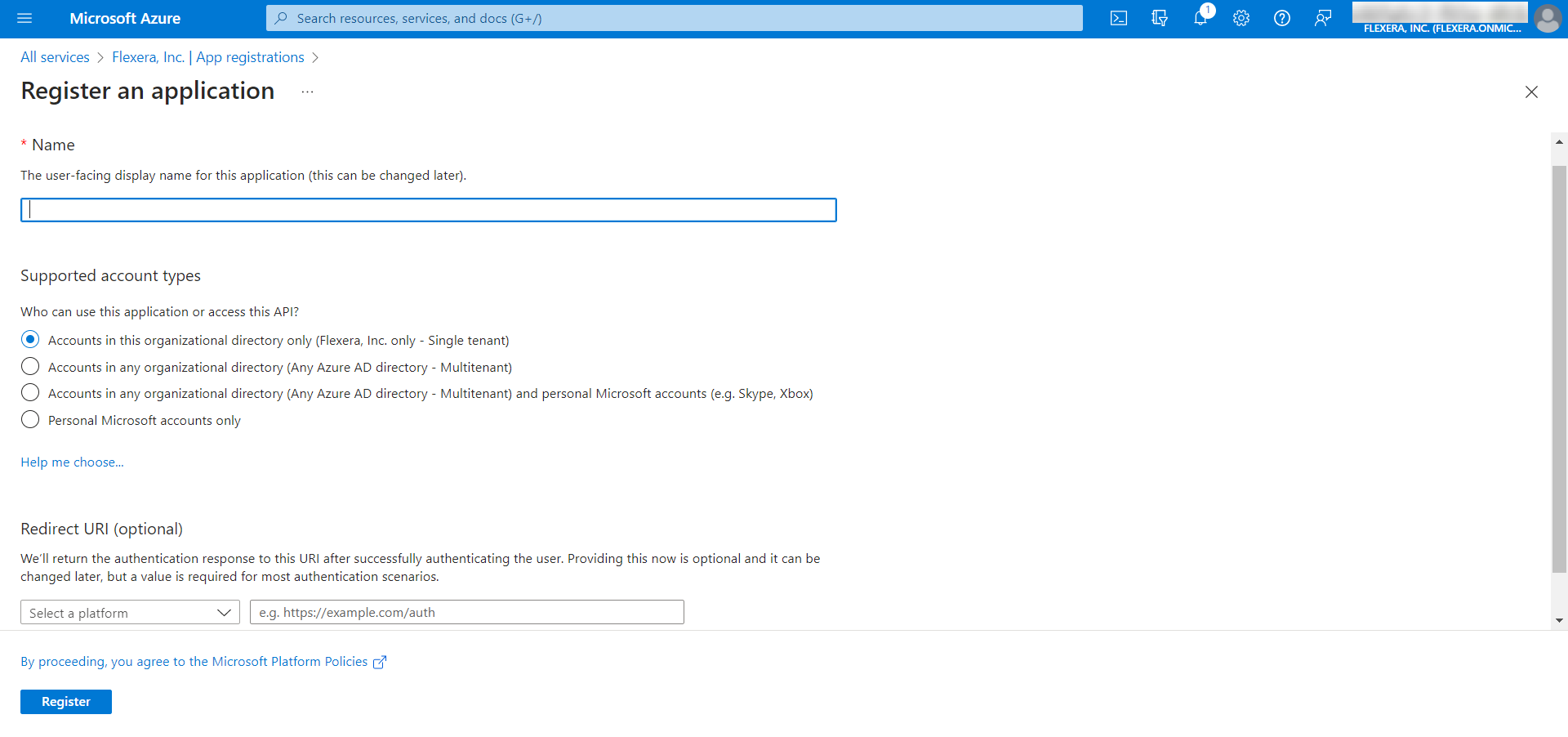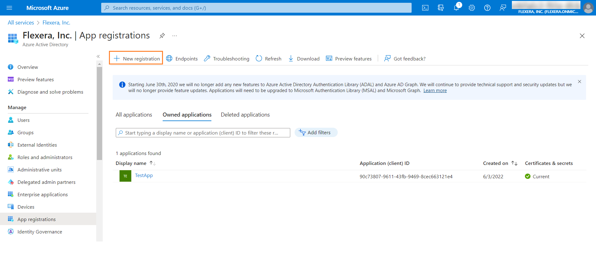 2. Enter keywords ( App registrations ) in search box on the Home page to search by name. The App registration page appears.