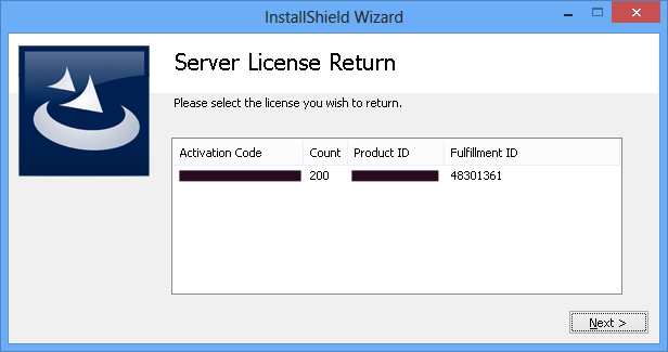 2. Select the activation code that corresponds with the licenses that you want to return, and then click the Next button.